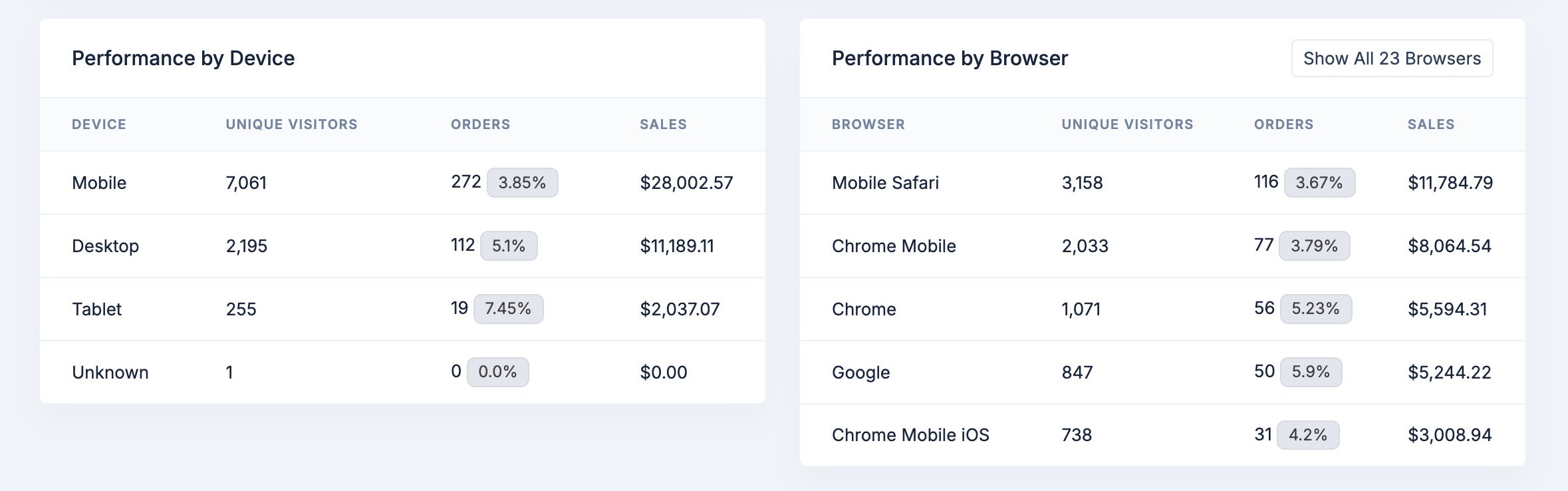 - Mobile conversion rates that suggest mobile-first checkout design needs